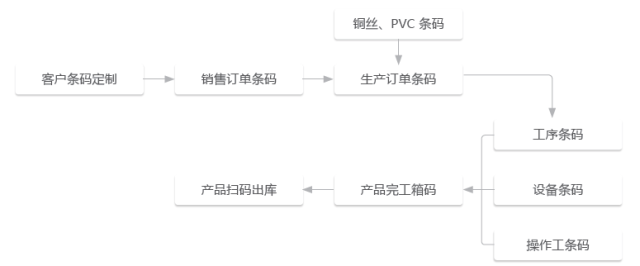 每家客戶,都有自己個(gè)性化的條碼要求。銷售訂單產(chǎn)生的同時(shí),銷售訂單條碼即刻生成。銷售轉(zhuǎn)生產(chǎn)訂單,形成車間的工序派工單,生產(chǎn)訂單條碼和工序條碼逐一生成。根據(jù)生產(chǎn)訂單,領(lǐng)用倉(cāng)庫(kù)的銅絲、PVC等原材料,均以條碼掃描的形式進(jìn)行領(lǐng)用消耗。車間報(bào)工,直接掃描設(shè)備機(jī)臺(tái)條碼,員工條碼,進(jìn)行合格數(shù)量、消耗工時(shí)等數(shù)據(jù)的報(bào)工。最終的產(chǎn)成品打包完成,貼上箱碼,成品倉(cāng)庫(kù)掃描入庫(kù)。根據(jù)銷售訂單要求,定期進(jìn)行掃描出庫(kù)。