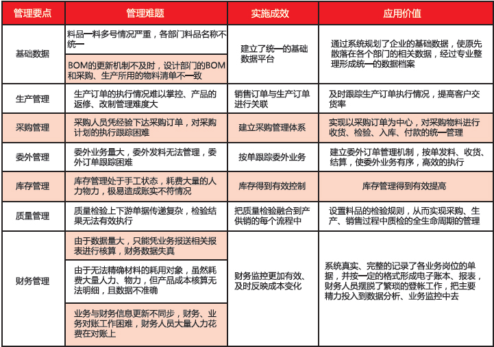 管理難點:在上用友ERP系統(tǒng)之前,由于數(shù)據(jù)量太大,手工只能核算最終產(chǎn)成品的成本,更改單的產(chǎn)品成本無法計算,對更改單只能計算每月增加的成本。